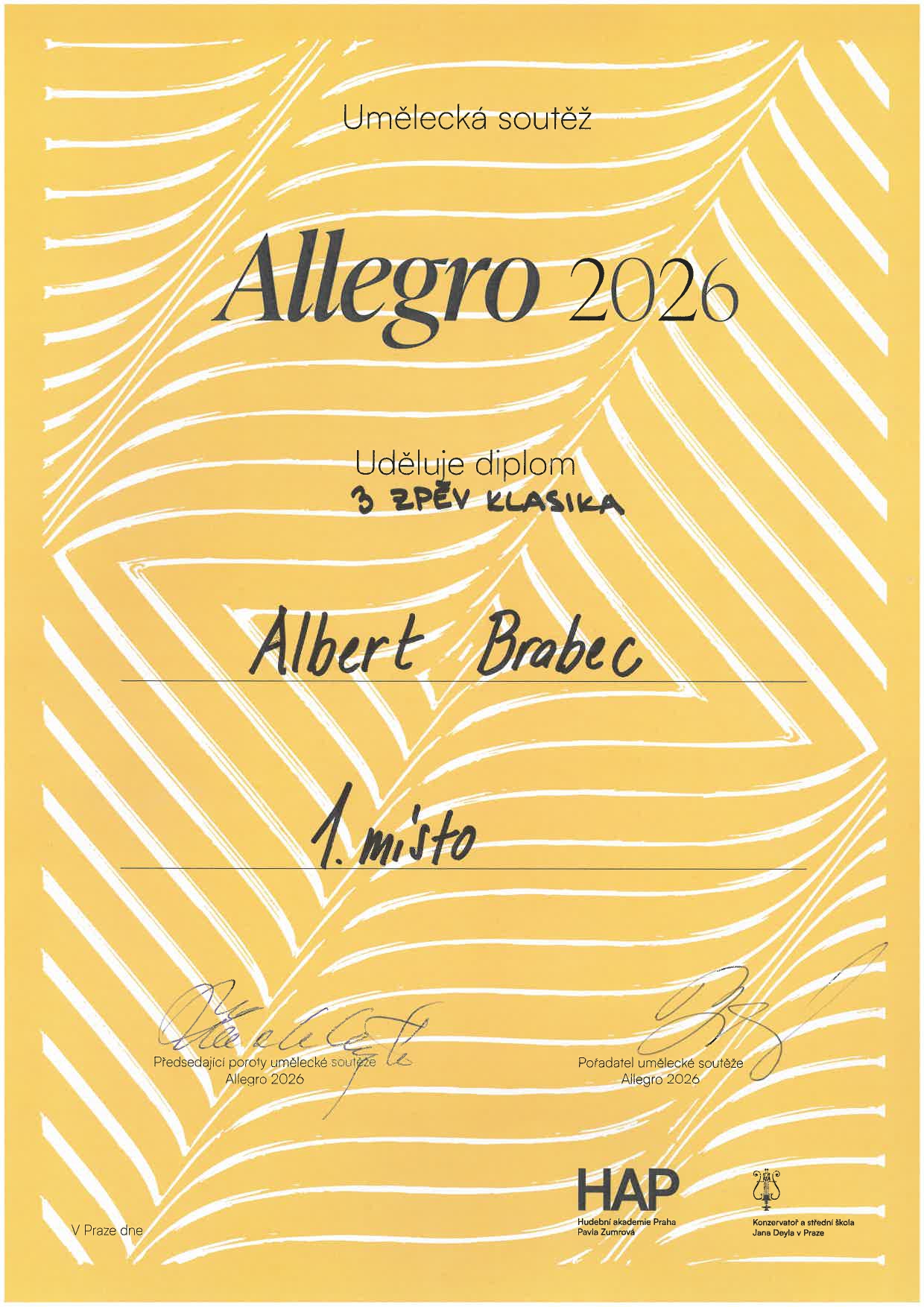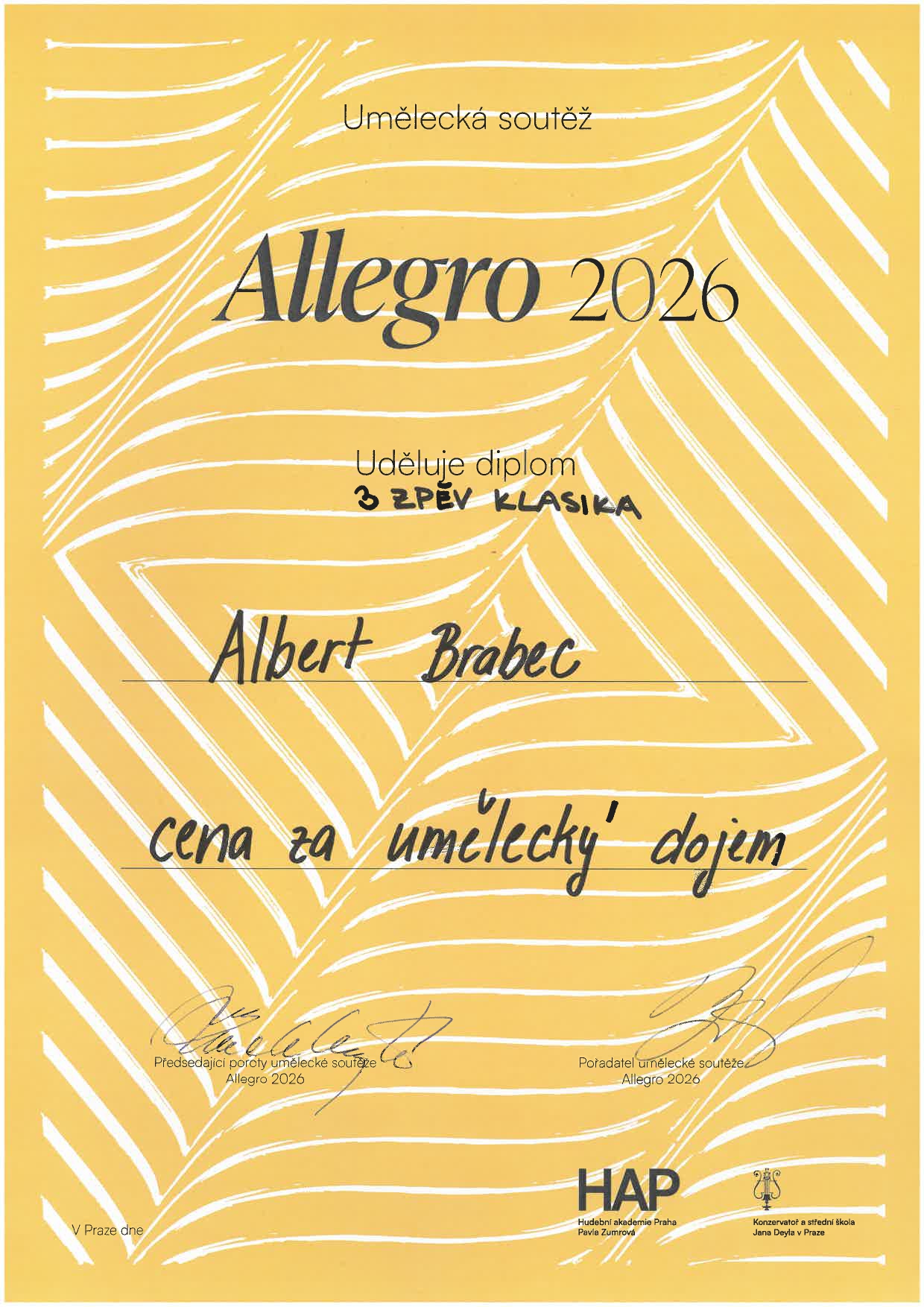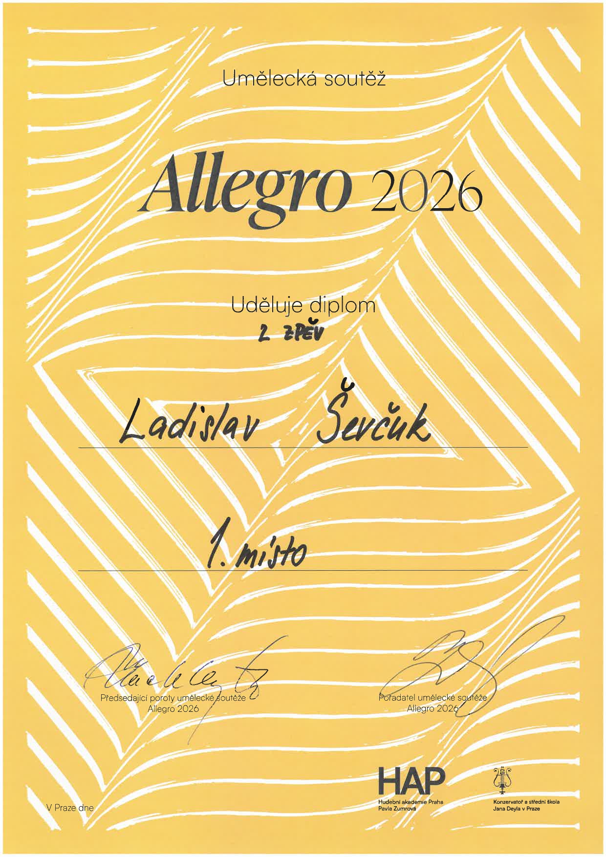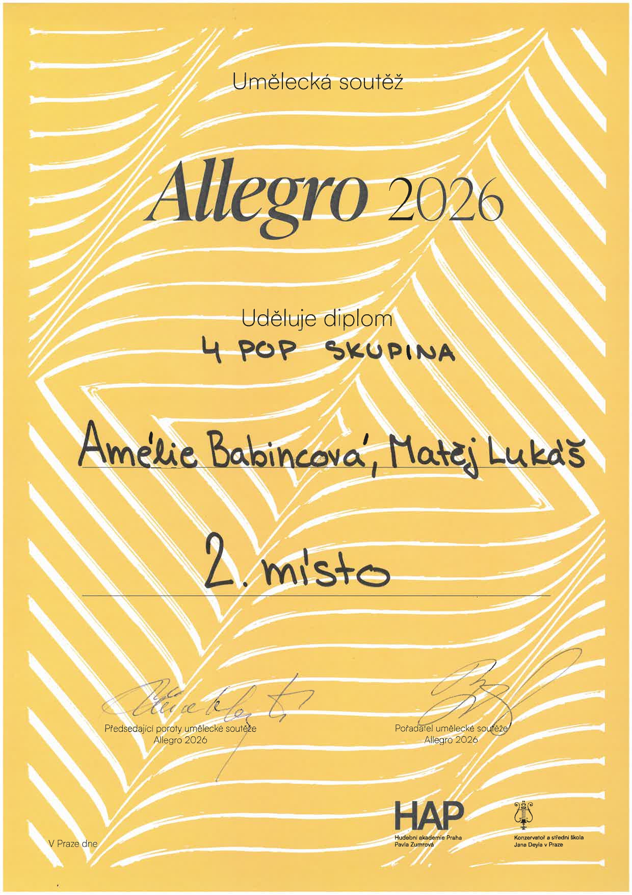 Na umělecké soutěži Allegro 2026 získalo 13 žáků naší školy ocenění! Ocenění žáci jsou ze tříd: