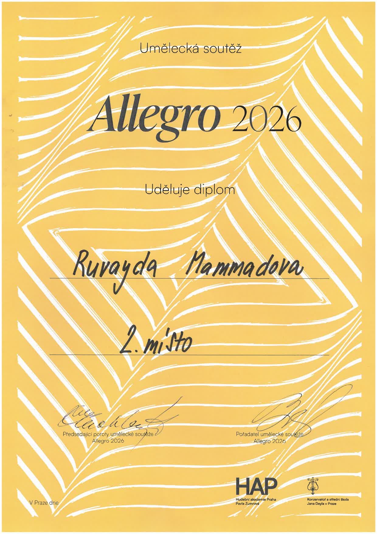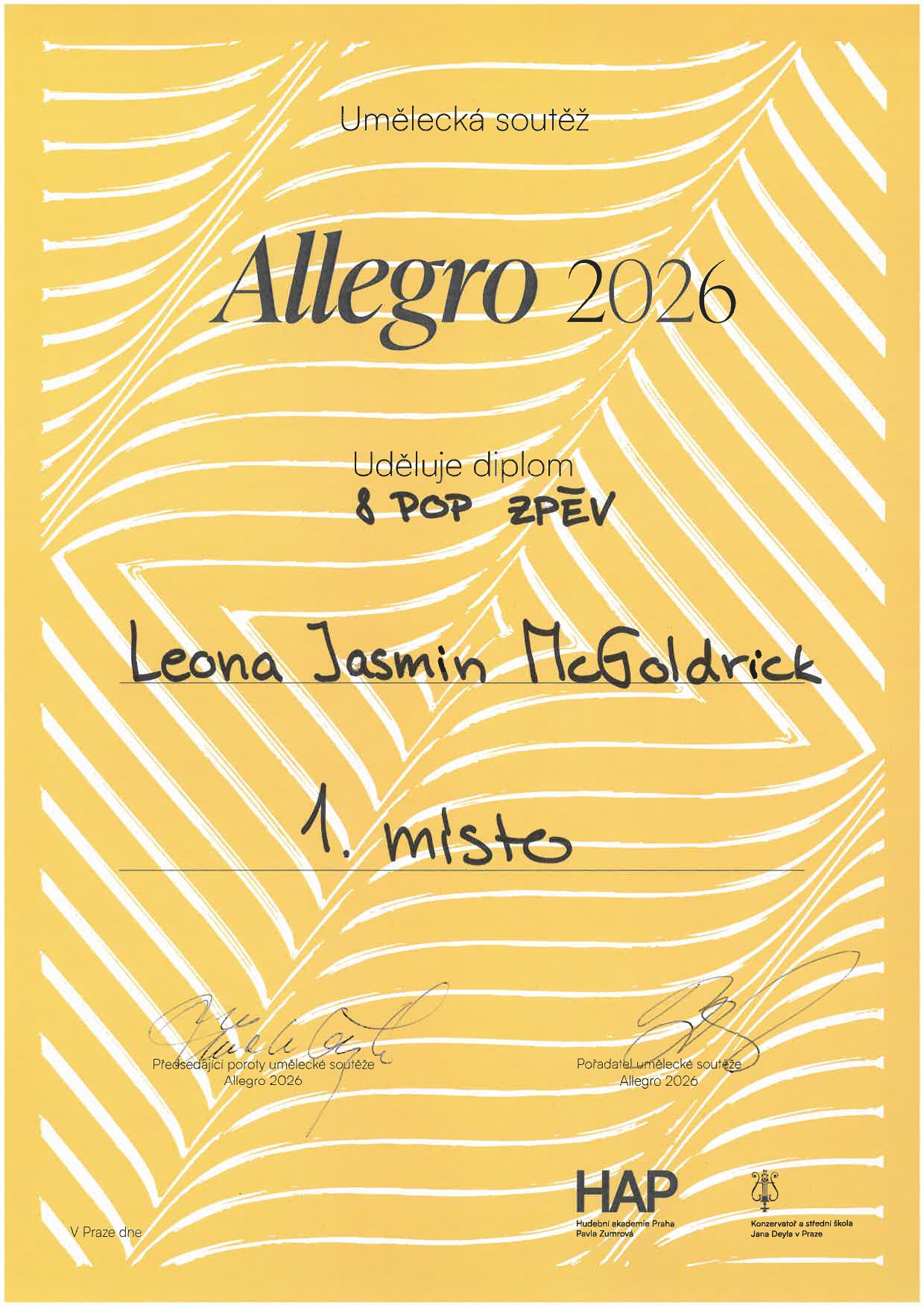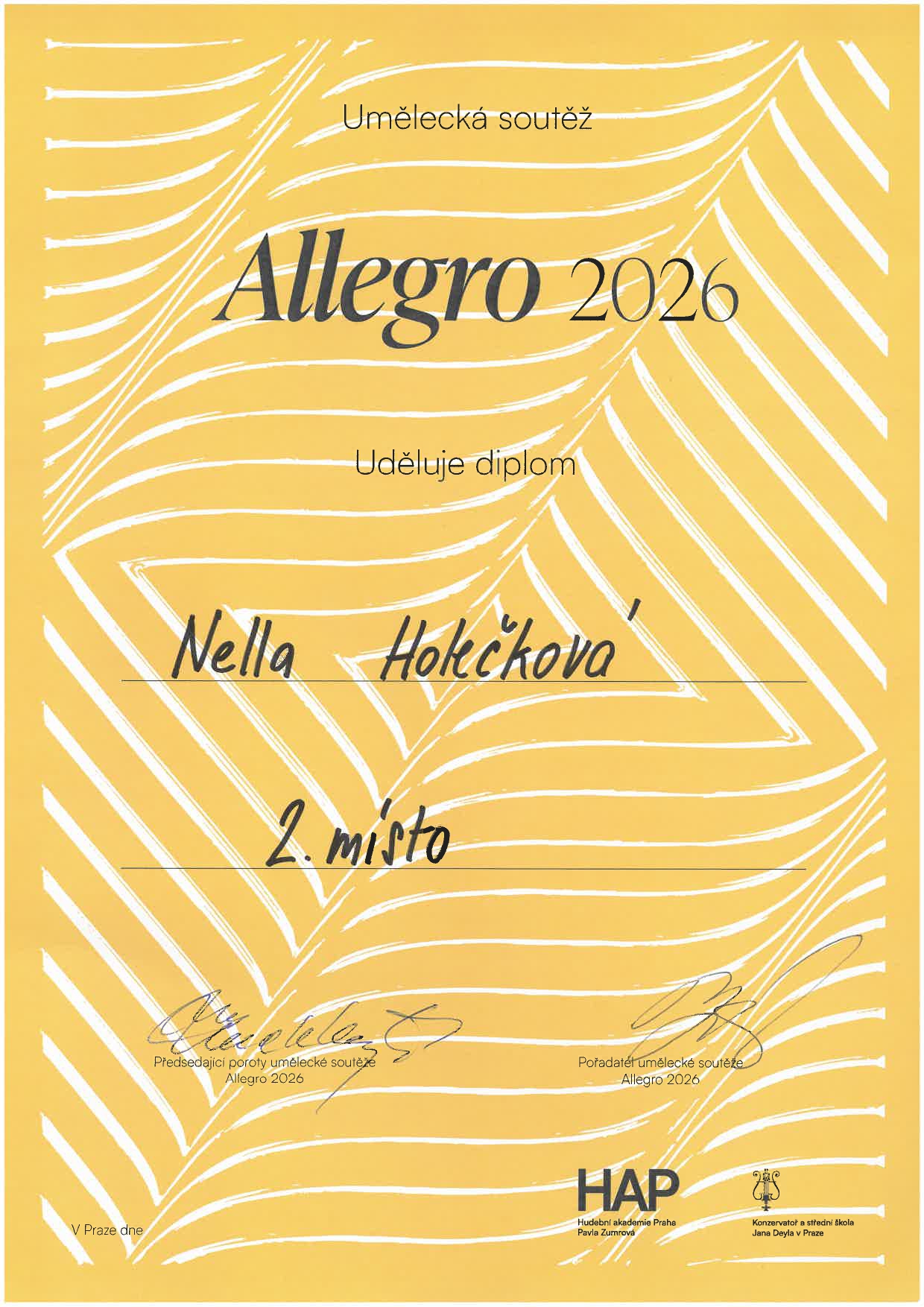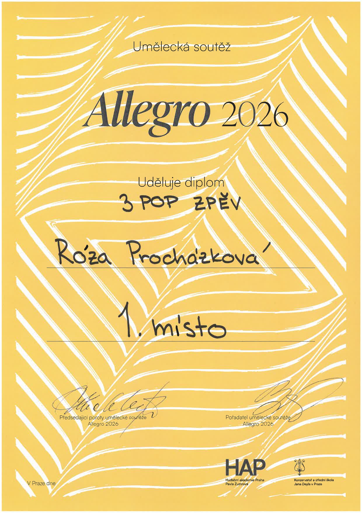 Na umělecké soutěži Allegro 2026 získalo 13 žáků naší školy ocenění! Ocenění žáci jsou ze tříd: