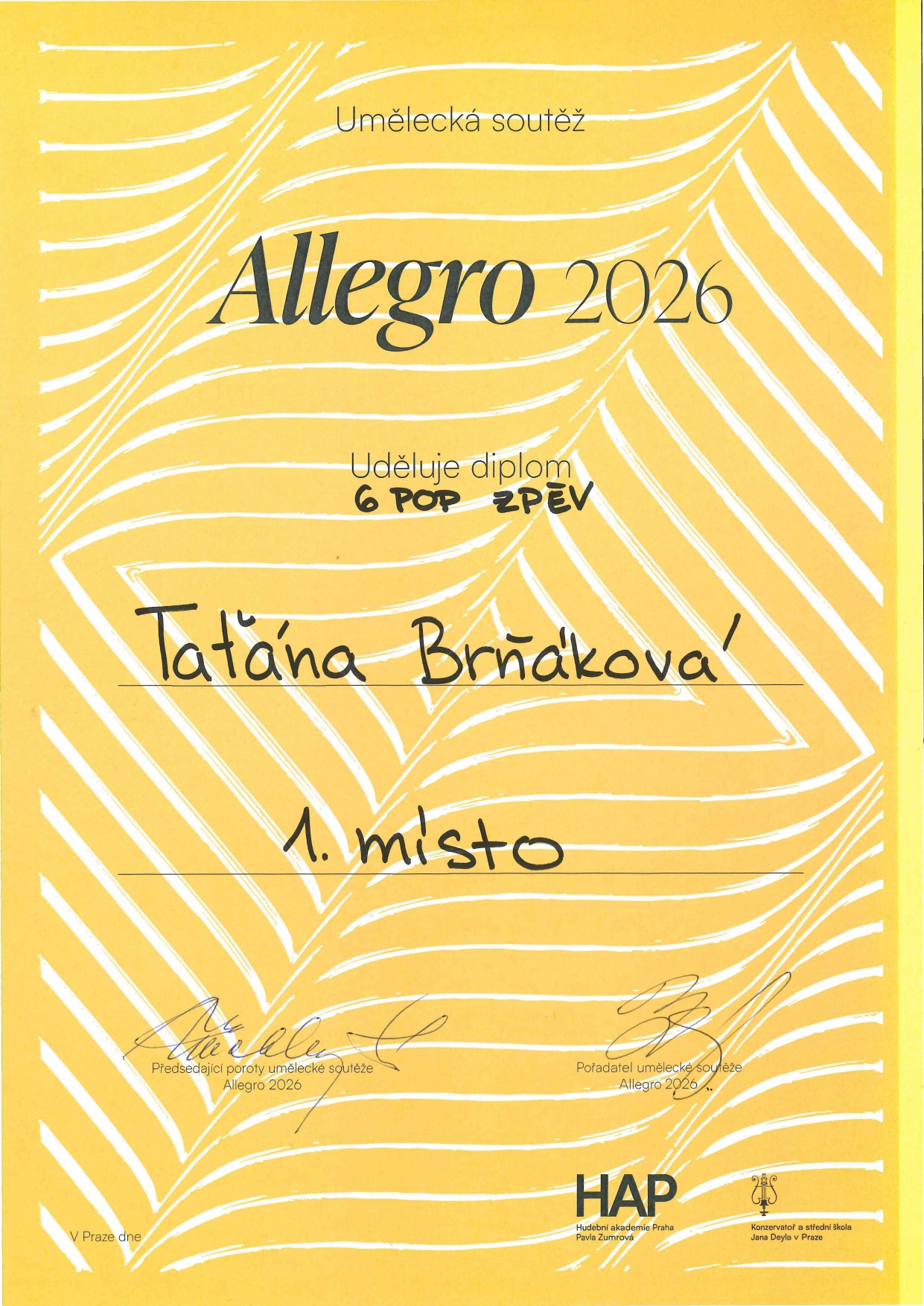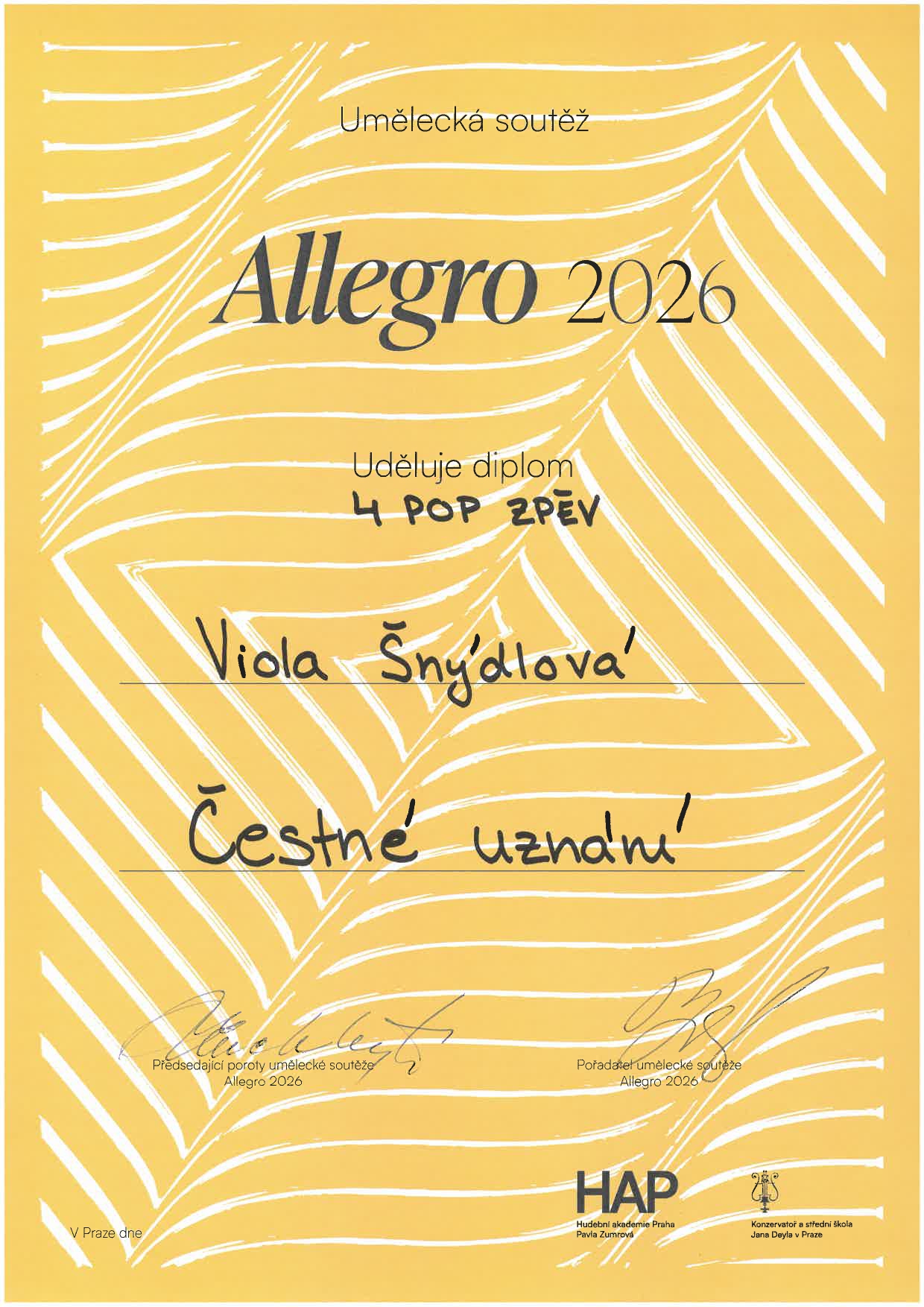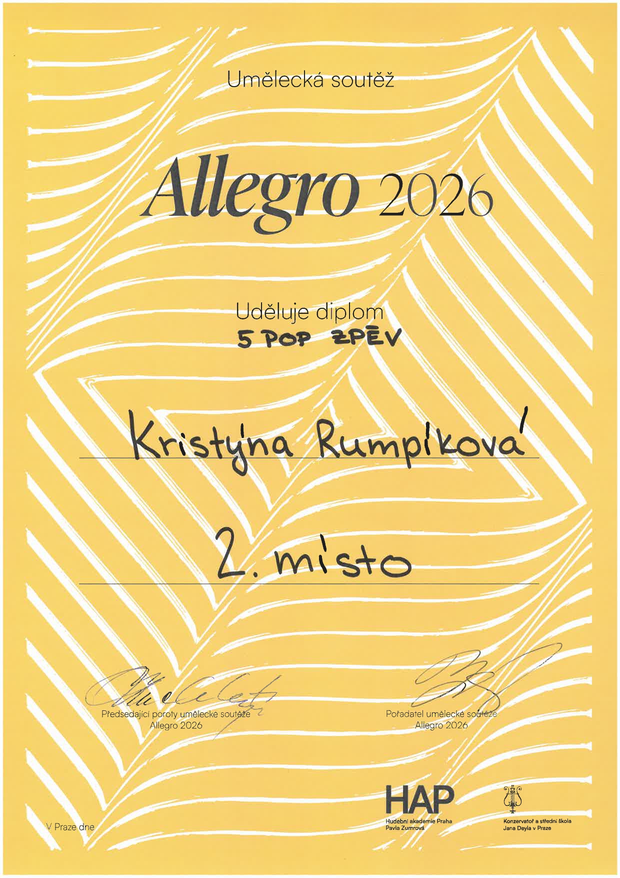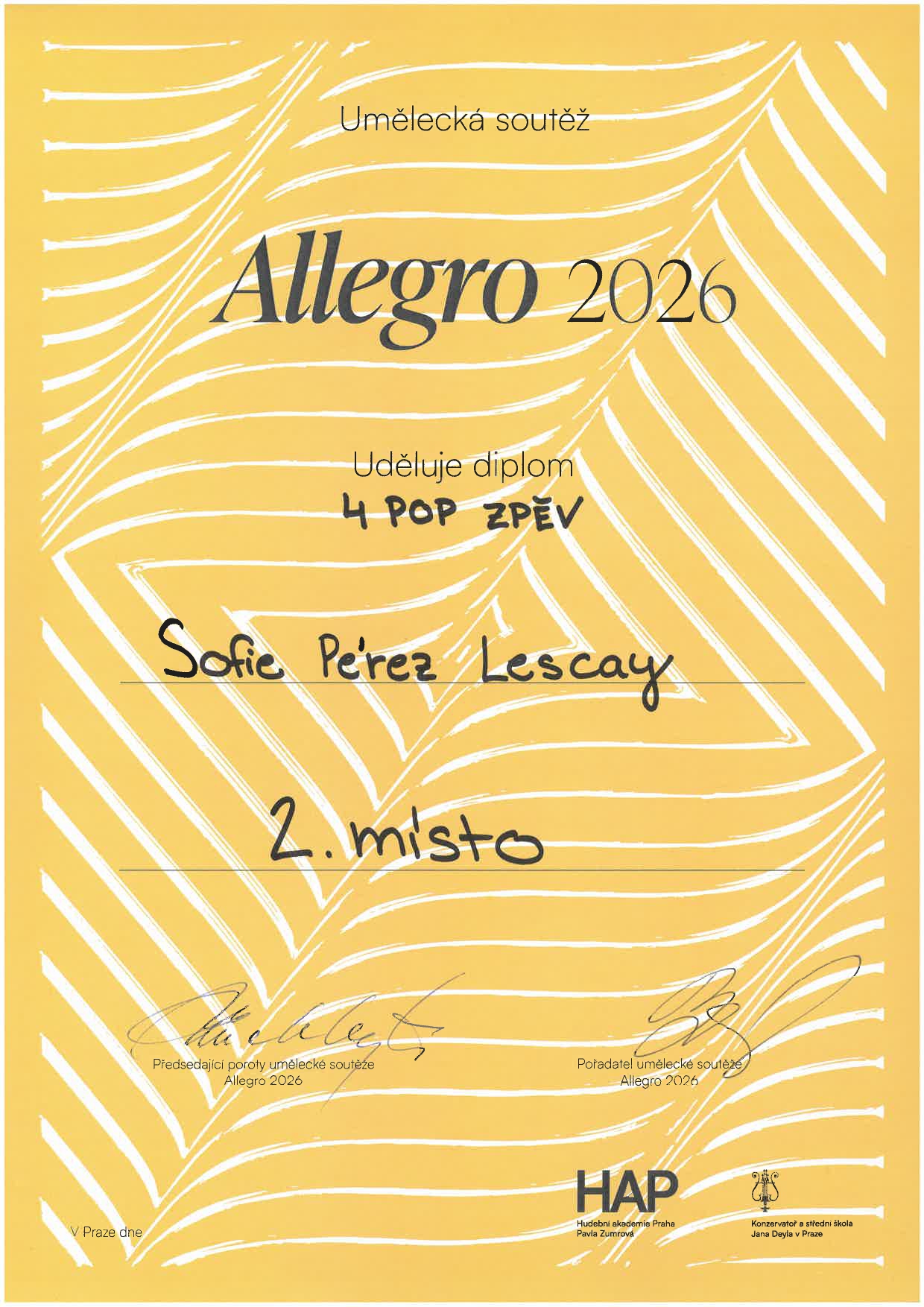 Na umělecké soutěži Allegro 2026 získalo 13 žáků naší školy ocenění! Ocenění žáci jsou ze tříd: