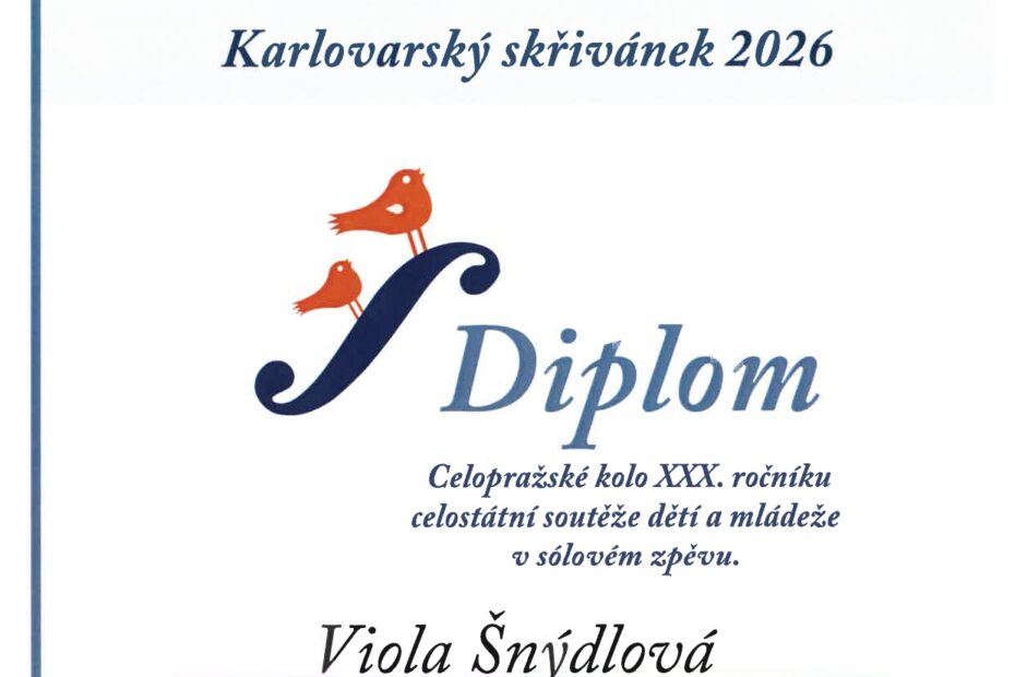 V celopražském kole XXX. ročníku celostátní soutěže v sólovém zpěvu Karlovarský skřivánek 2026 získala Viola Šnýdlová ze třídy pí uč. MgA. Magdy Novotné čestné uznání. Gratulujeme!