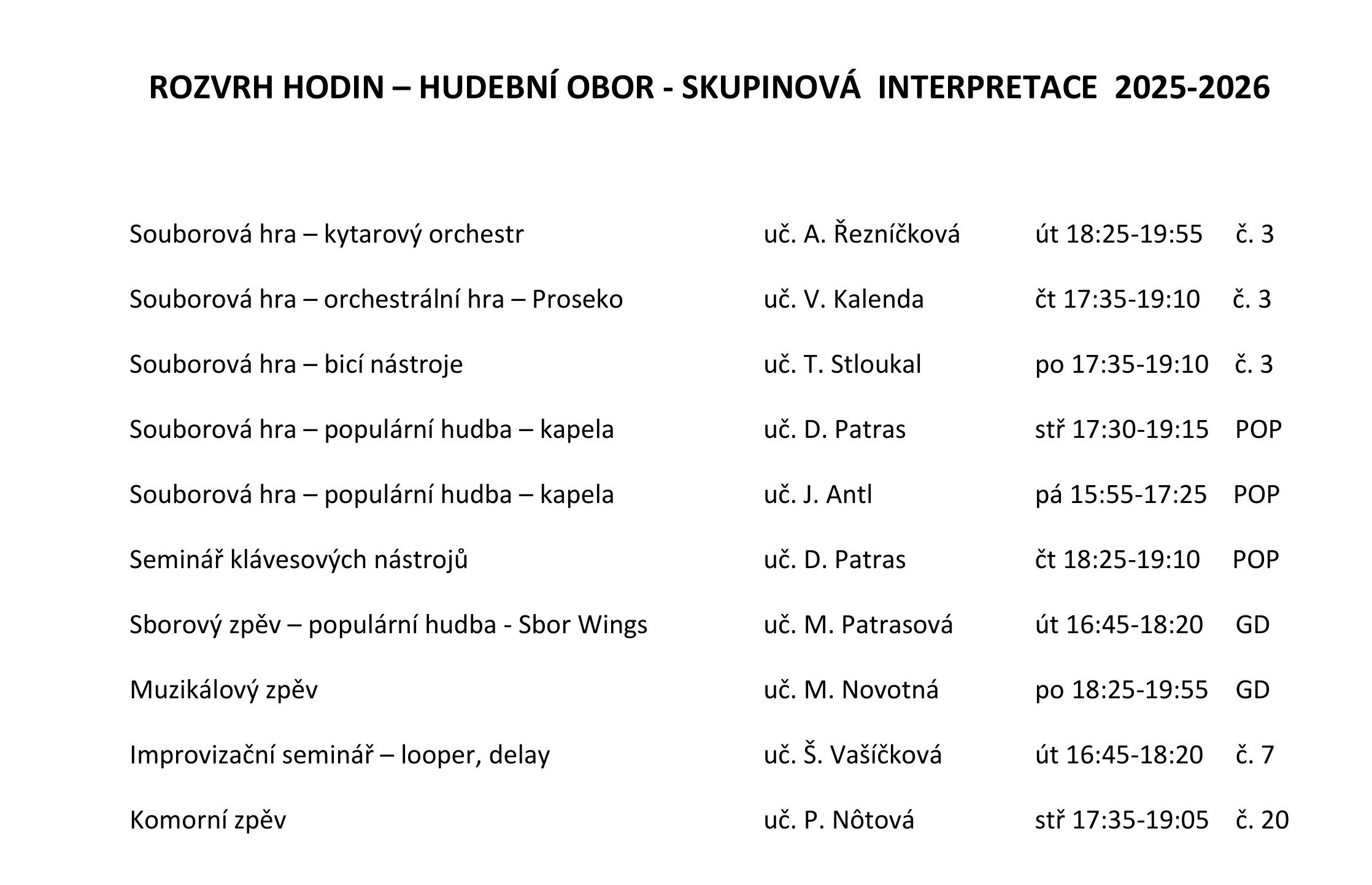 Všichni žáci hudebního oboru 1. – 4. ročníku II. stupně mají povinnost navštěvovat týdně jednu hodinu vybraného předmětu skupinové interpretace.